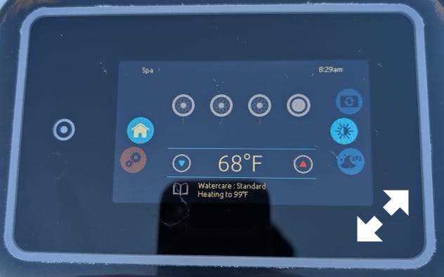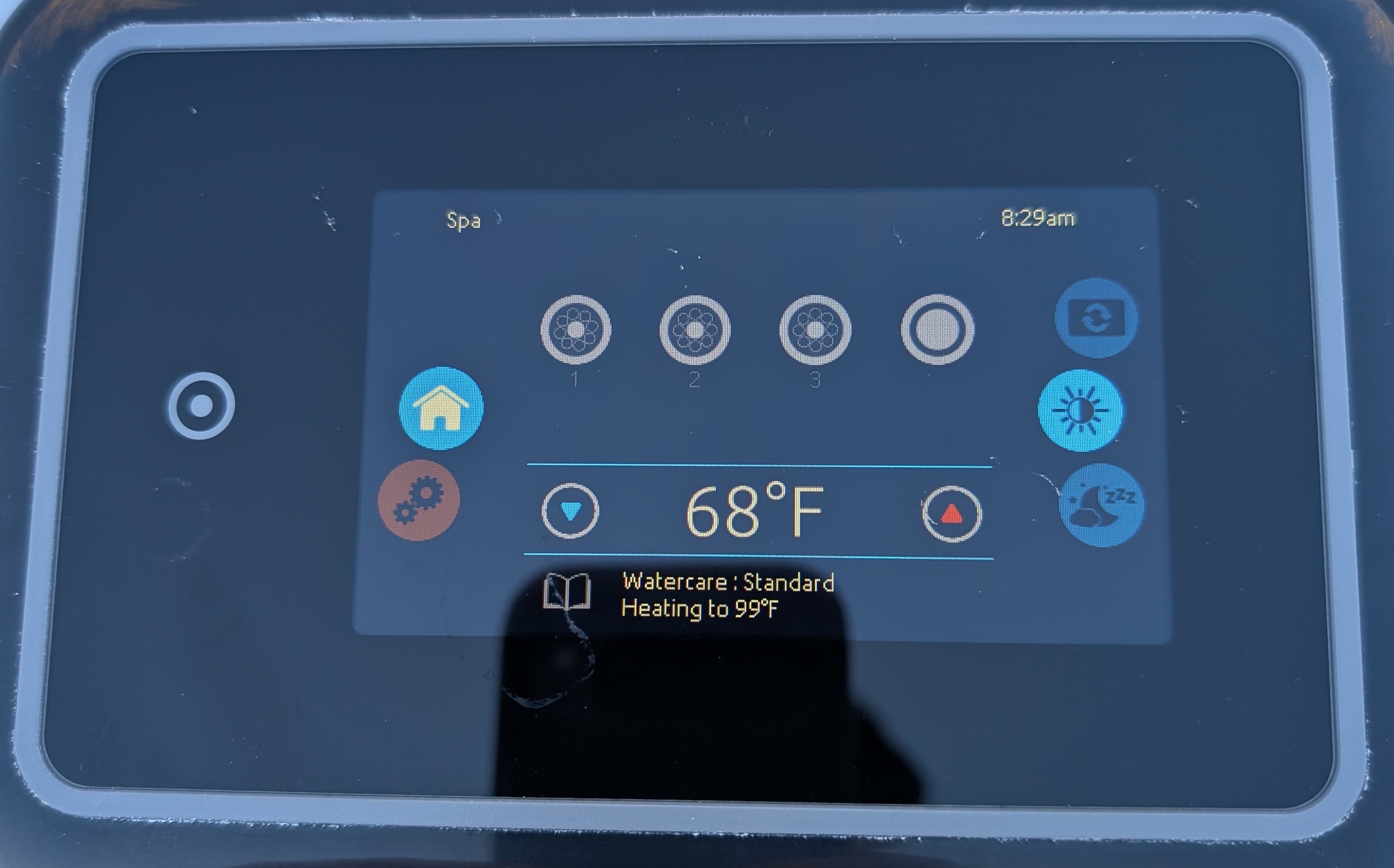 To start the spa tap the screen then slide the blue icon on top of the white icon. This will show you the control panel. You will now see four circles across the top. Each controls the jets in a separate area of the spa.
