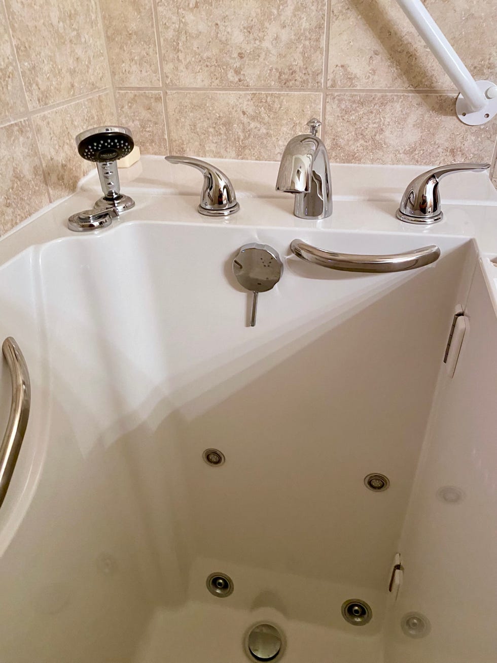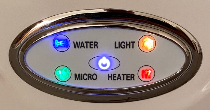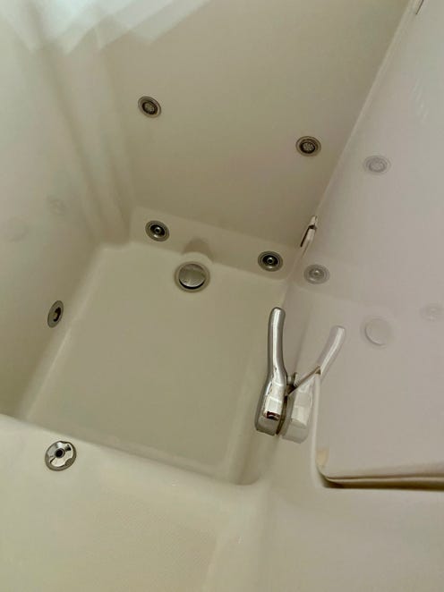 Once the water is above the jets in the back of the seat. You can now push the water button to turn on the jets. There is a knob next to the hand sprayer to target the jets on your back or your feet.